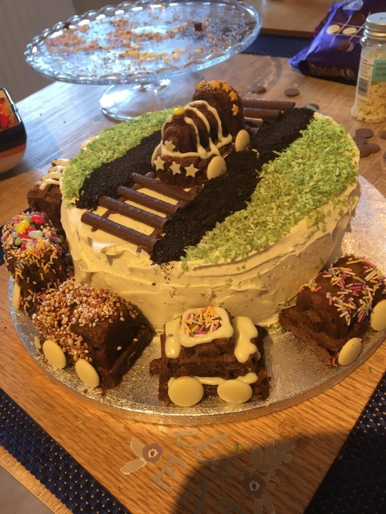 My son decided he wanted a train cake. I knew it was important to him so I gave it my best go. I worked out a design in my head and spent two days baking, cutting and decorating. The final cake turned out closer to what I had imagined than I had dared hope. He was delighted with it.