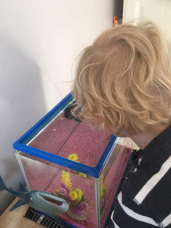 Now the fish are happily ensconced, swimming around in our little tank. Our son is learning a little bit about responsibility, having taken on the job of feeding them.