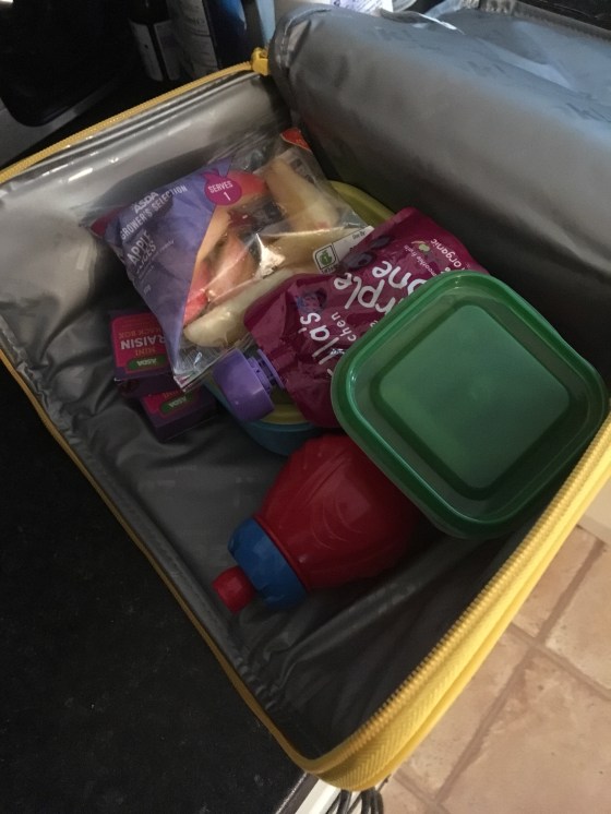 I put the pasta in a Tupperware container and then into his lunch bag along with some sliced apple, raisins, breadsticks, a smoothie and his water bottle. There’s probably too much there but I want to give him options because there’ll be something he refuses.