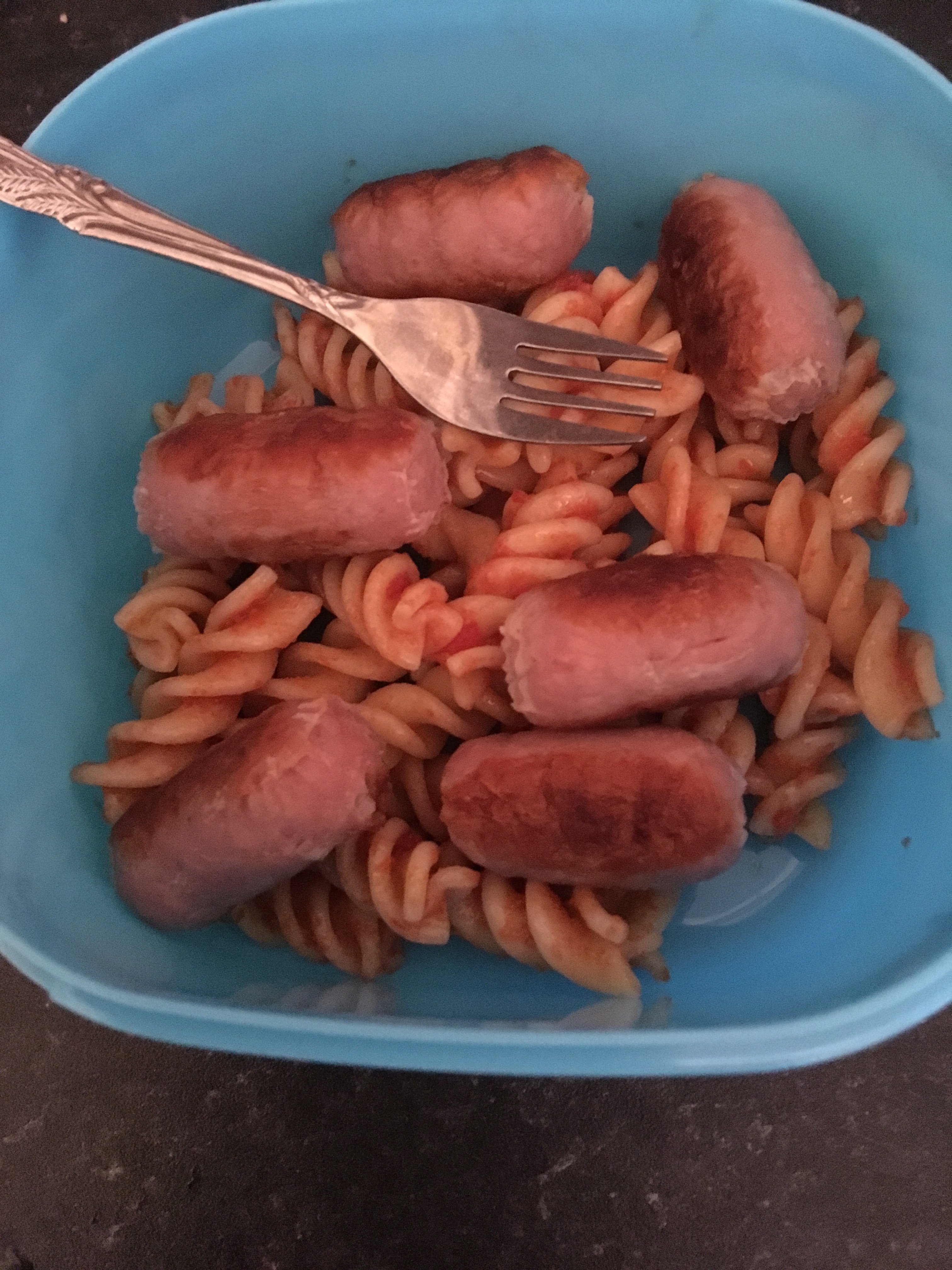 There’s simply no time to make anything else so we strike the most hopeless deal since the 1938 Munich Agreement. The pasta and sausage will stay in the lunchbox but I tell him he doesn’t have to eat it.