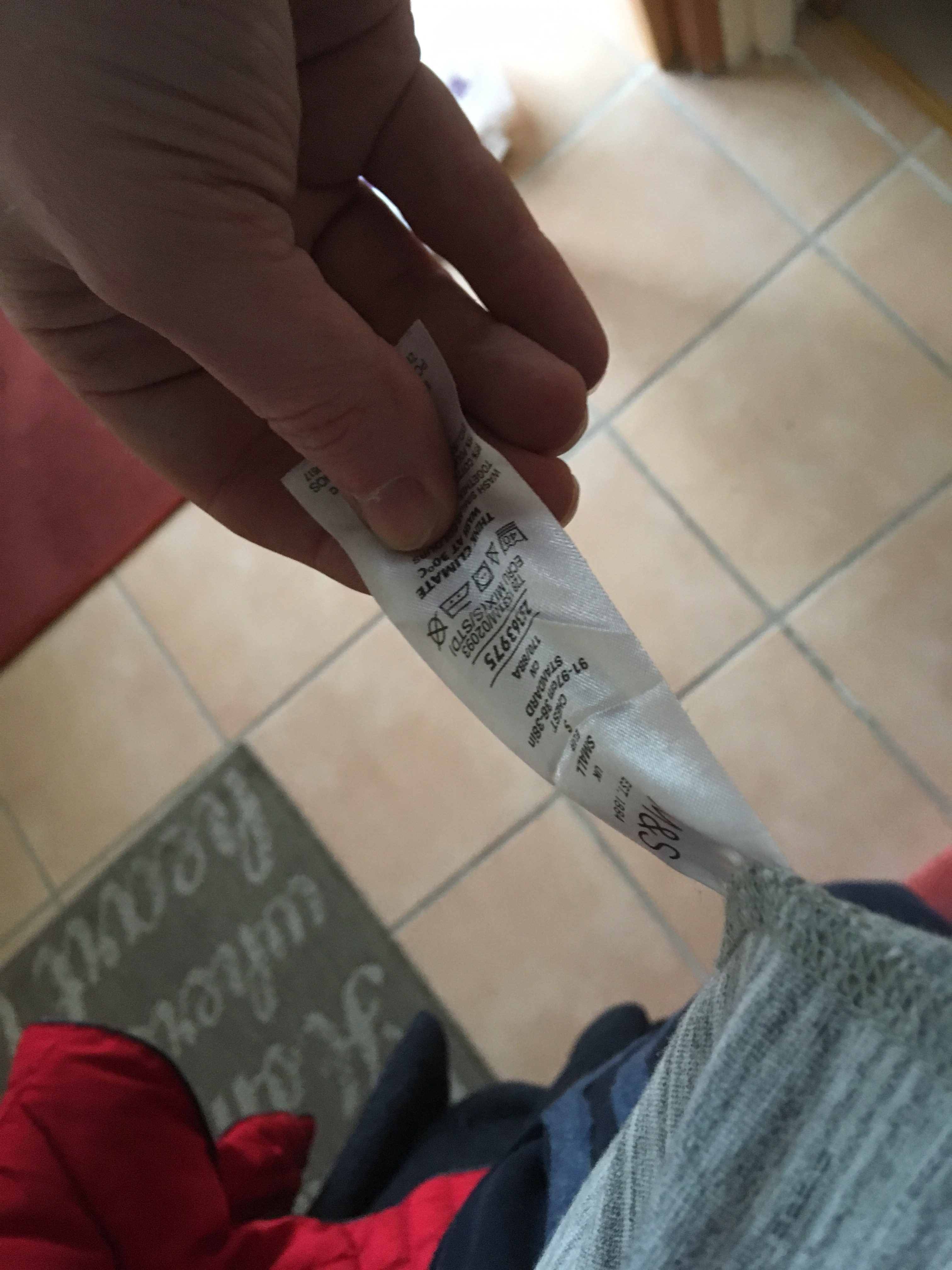 And just in case I was able to pass any of this off as a daring sartorial statement, there’s the two inch label flapping from the side like a thirsty pup’s tongue.