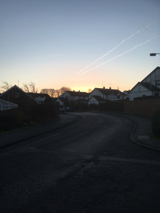 I gaze upwards. There’s a flinty blue sky and the beginning of a sunrise over the roofs of the distant houses, just a promise at this hour.