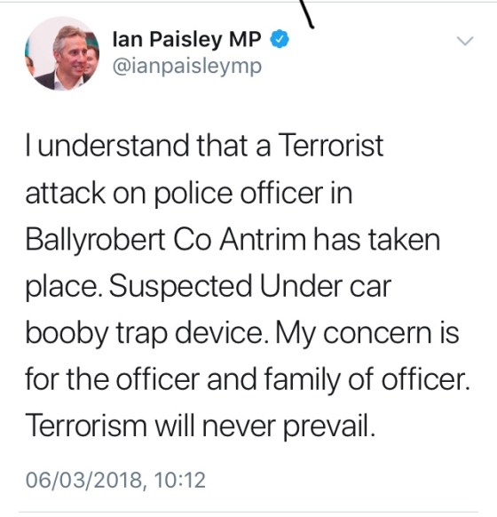 ‘Breaking: Ian Paisley MP has told the Nolan Show there has been a terrorist attack on a police officer this morning. He says a explosive device was placed under a female police officers car’.