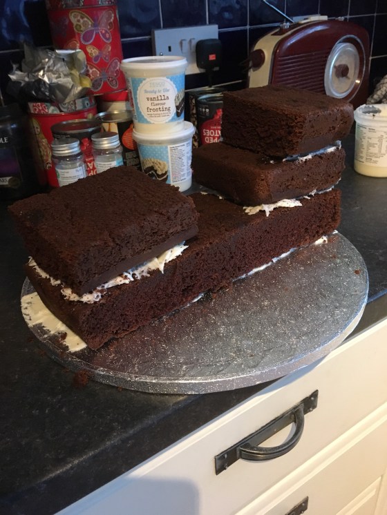 The first bit was easy. I baked a chocolate cake in a large rectangular cake tin from an old recipe I’ve used before. When cooled I cut it into two long thin rectangles, one became the main body of the ship and the other I sliced into three parts to become the raised prow and stern.