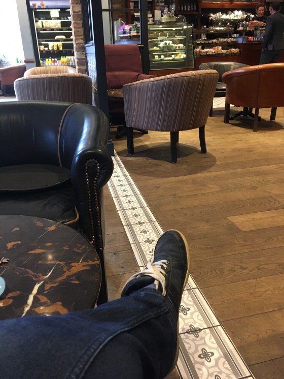 I go to my usual seat and study the faces, some are regulars, some new. There’s the guy in the tweed jacket with his laptop, who I’ve long ago decided is an academic. The woman who wears the black sandals who has a different book everyday. The older woman who ties her dog to the railings outside and then picks the window seat with a clear view of it.