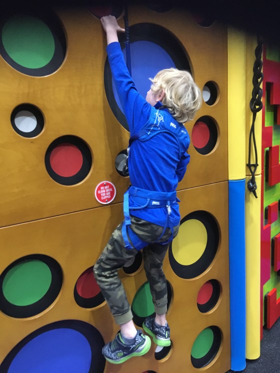 Some of the other children in attendance were already climbing. My son preferred to walk around for a bit first, getting his bearings. Then he selected one of the walls which looked easiest.